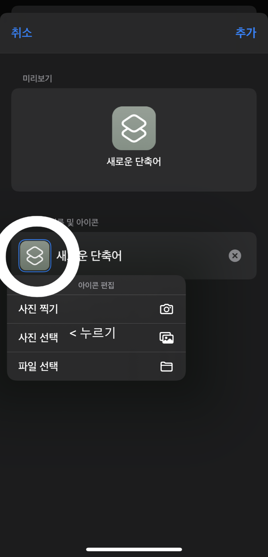 9. 이후의 과정 역시 동일합니다. 단축어에서 사진 선택에서 홈화면에 추가하기.